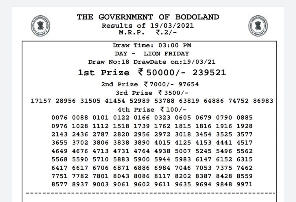 Result of the Bodoland Lottery Result Today 20-3-2021 Live
