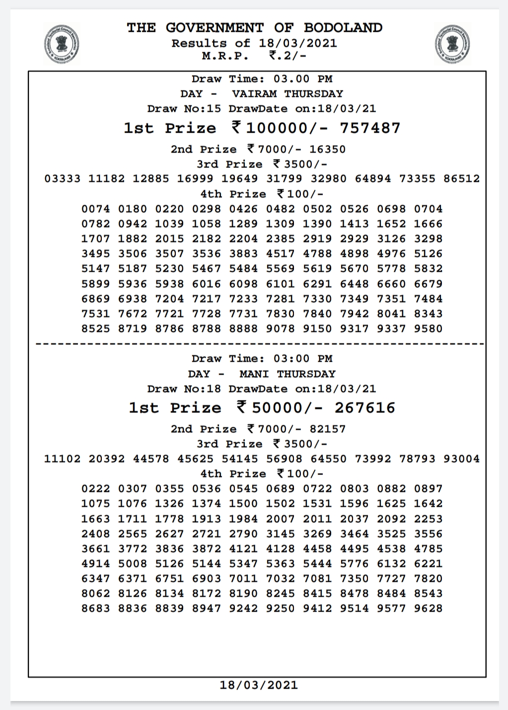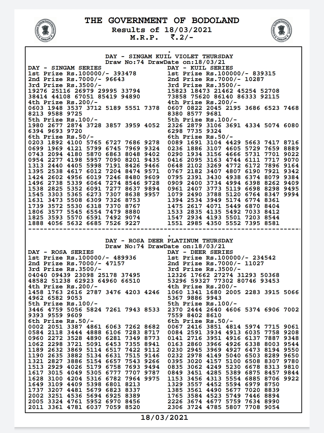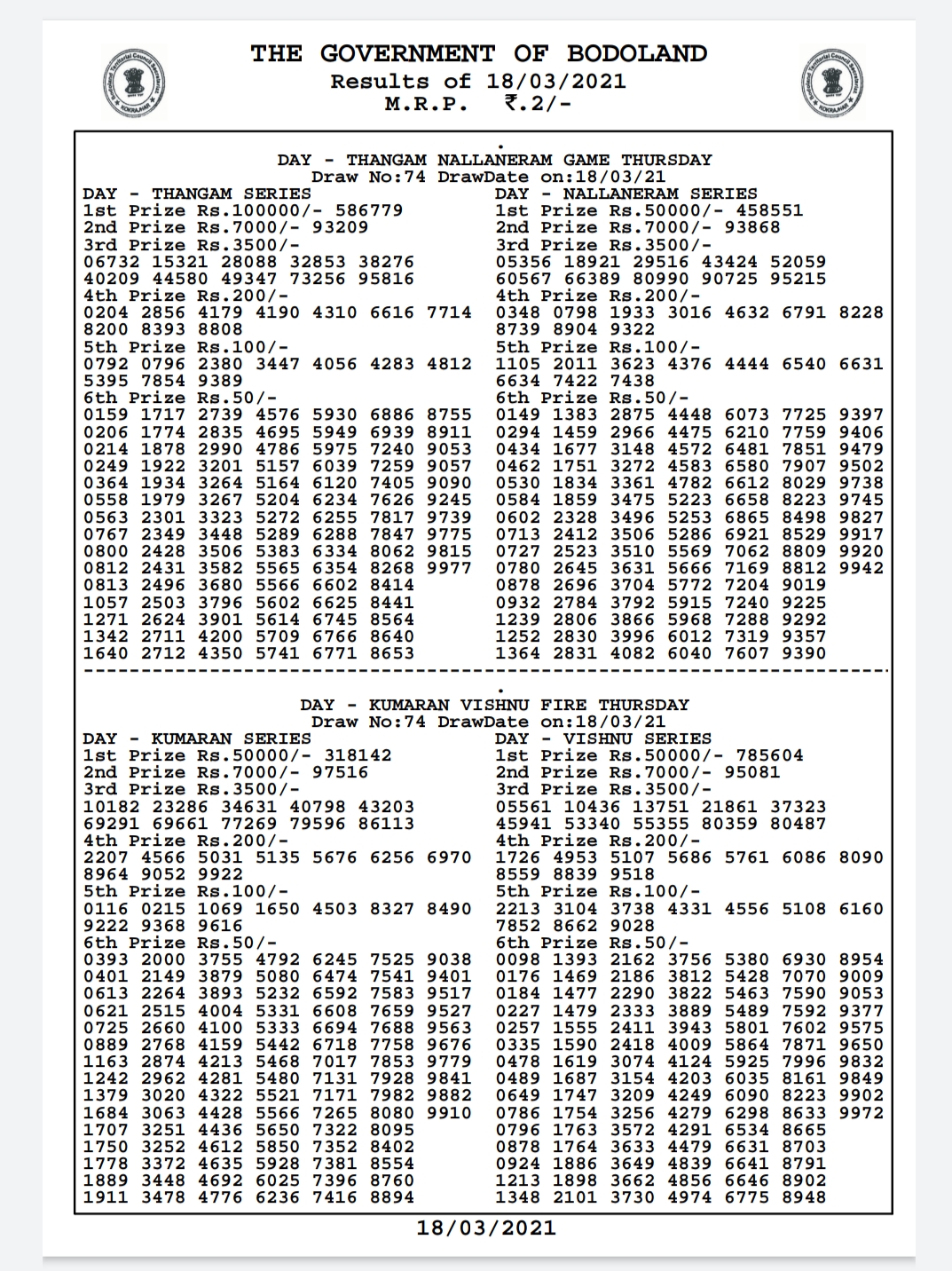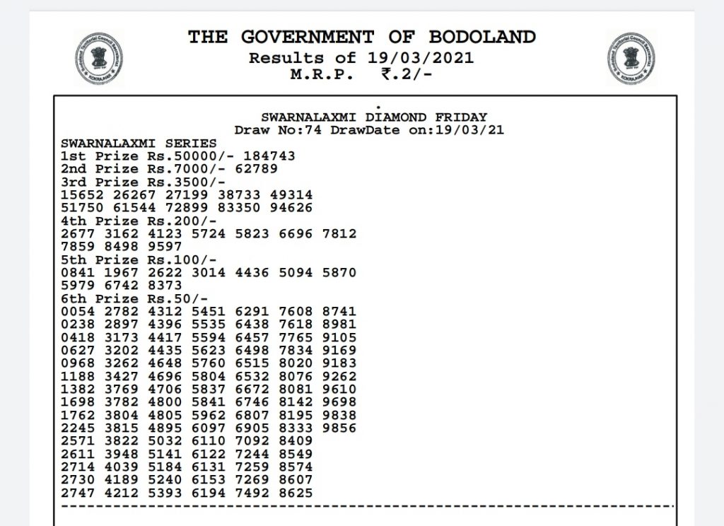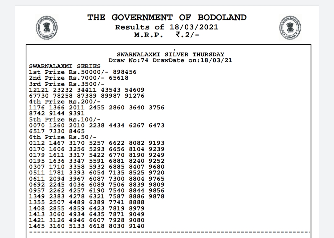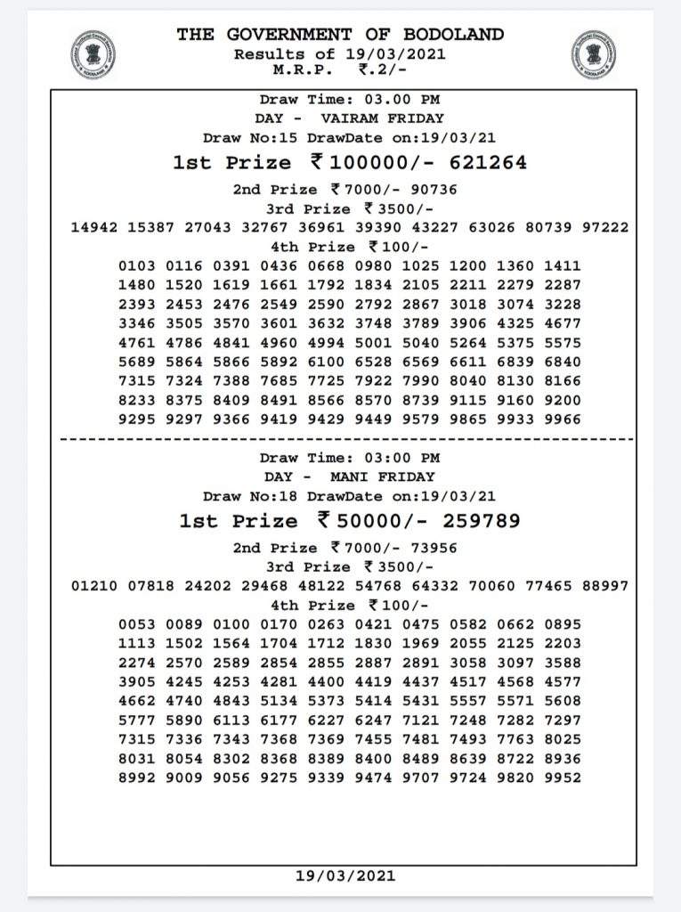 Bodoland lottery Result Today 20-3-2021 Live.