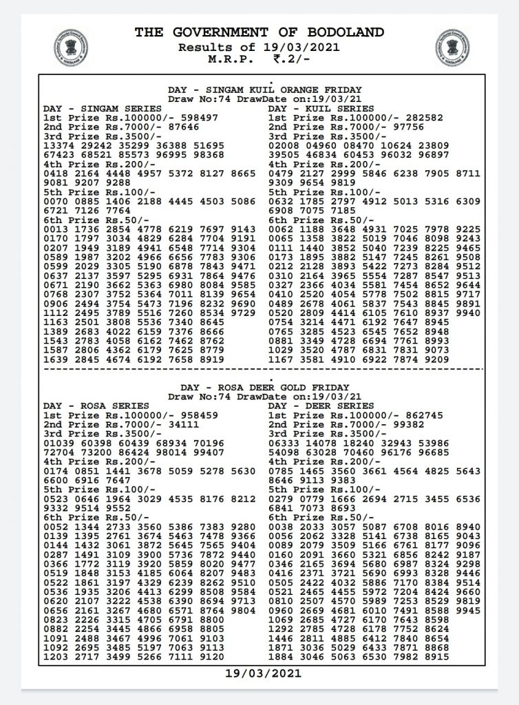 Bodoland lottery Result Today 20-3-2021 Live, Check www.bodolotteries.com: The Bodoland Lottery Department has released the Bodoland State Lottery Result on the Web site. The people who purchased the Bodoland Lottery tickets on 3/20/2021 can use this article to get the Bodoland State Lottery Result on 3/20/2021. Here you can look for Bodoland lottery result Today 20.3.21, Bodoland state lottery result lives, Rosa Deer lottery results, Kumaran Vishnu lottery results, Singam Kuil lottery result, Swarnalaxmi Gold lottery result, Thangam Nallaneram lottery result, Bodoland Lottery Result Today 20-3-2021 Live, Bodoland lottery result Singam, Bodo lottery Kuil and Thangam lottery result Today 20 3 2021 details are given below.