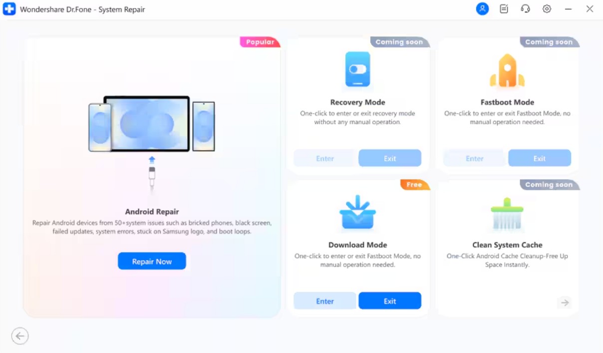 - Frozen Mode: When phones get stuck in Recovery or Download mode, Dr.Fone safely exits them. It recovers system control and restarts the interface without manual flashing.