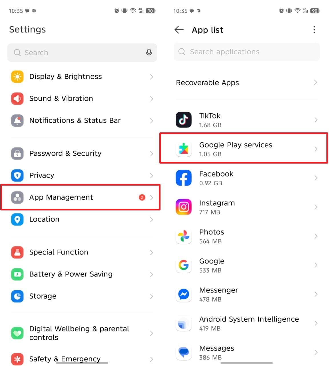 Step 1. To initiate, access the “App Management” section in your device settings to view your apps and tap “Google Play Services.”