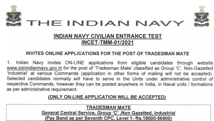 Indian Navy Merchant Companion Hiring 2021: Indian Navy invites online applications for eligible candidates for the position of Tradesman Mate classified as group C, Unofficial Industrial in various commands.