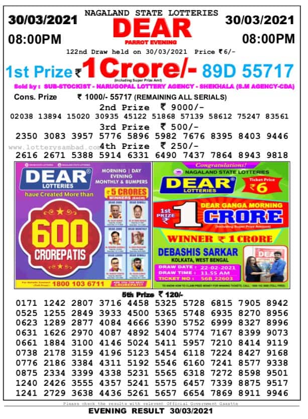 Lottery Sambad Night 8 PM Result Today 31.3.21: