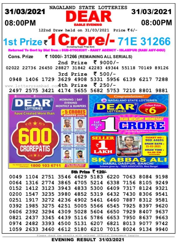 Nagaland State Lottery Result Today 31-3-2021 Live 8 PM